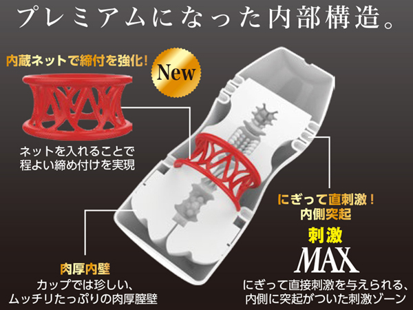 むっちりとした内壁で包み込み、内部の突起でダイレクトに刺激!内蔵されたネットリングがしっかり締め付け、さらに握ることでより快感が高まります。