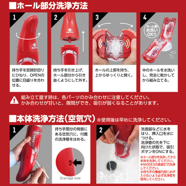 そして特筆すべきはこれまでの電動ホールの常識を覆す、吸い込まれるバキューム機能!突出した挿入口に鮮やかな赤いプラスチック製のボディ。