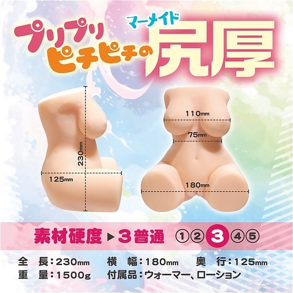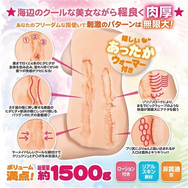 ゴージャス二穴構造?蜜ツボ×プリ尻のクールビューティのマーメイドヒップを再現!<ヴァ○ナ>・マーメイドらしいクールな締付けでクリュクリュとチ〇ポをお出迎え♪・さざ波の様に押し寄せる無数のヒダヒダ+砂浜の様にしっかり感じるバツグンのヒダの密着感?奥まで行くと4本のヒダヒダが全体を包み込み、至れり尽くせりの蜜ツボ快感がクセになる?<ア○ル>プリ尻にぷりゅんと吸い込まれるが入口は意外とキツキツッ?ゾリゾリロードにより、まるでビックウェーブのような快感が無限大にアナタを襲うボディは230×180ミリ、1500グラムと程良く肉厚ながらも動かしやすいサイズで正常orバックor座位、その日の気分で楽しめる!浜辺のクール美女のプリプリ、ピチピチのマーメイド尻厚&極上締付けを堪能しよう!肌に直接触れるものだから、安心安全の日本製あって嬉しいあったかウォーマーも同梱!