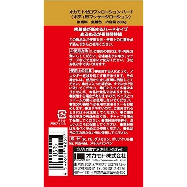 オカモトゼロワンローションのハードタイプはアナルプレイにお勧め!密着感高まる乾きにくさにこだわったアナル ローション「オカモトゼロワンローション ハード」200ml。