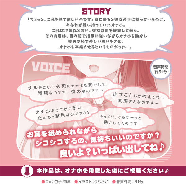 バイノーラル録音で、実際に目の前で囁かれているような超臨場感!?CV:杏子御津様の可愛いお声によるオナサポ音声です♪「あなたはもう、私が「いいよ」っていうまで絶対逝ったらだめなのです」「お耳を舐められながらシコシコするの、気持ちいいのですか?」「サルみたいに必死にオナホを動かして、滑稽なのです…」「オナホを動かす手は、止めちゃ駄目なのですよ?」あなたの行動は管理され、出したいタイミングで出すことも許されない…最後は耳舐めをされながらのフィニッシュで、今までとは違った快感を…時間:61分