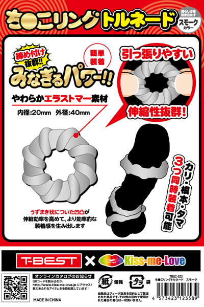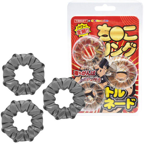 <T-BEST×KISS-ME-LOVE>夜もがんばリングで大人気のやわらかメンズリング「ち●こリング」が、トルネードになって新登場!今度のち●こリングは「特殊形状3個セット」!トルネードデザインのリングを3つもセットにしました!うずまき状に巻き付いた凹凸が伸縮率を高めてより効率的な装着感を生み出します。