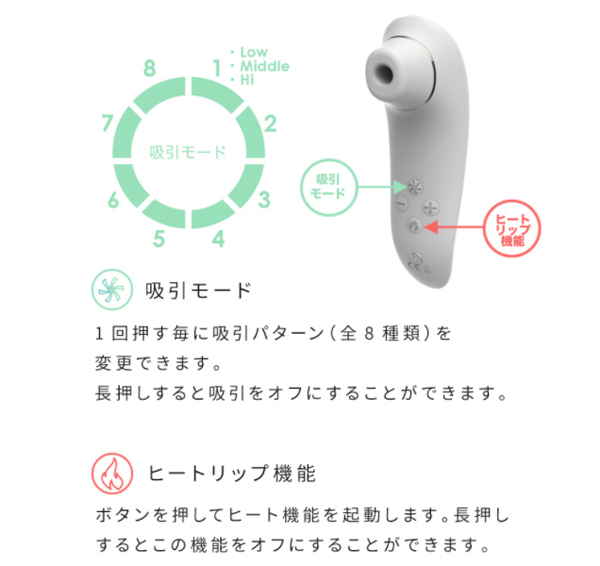 間接的な吸引で敏感部分への負担を軽減しつつ、衛生的で痛みのない刺激を実現!吸引は全8種、唇の温もりを体験できる寒い季節に嬉しいヒートリップ機能を搭載し、IPX7等級の完全防水製で浴室プレイや丸洗いも可能♪携帯にも便利な高級感のある吸引ローターです。