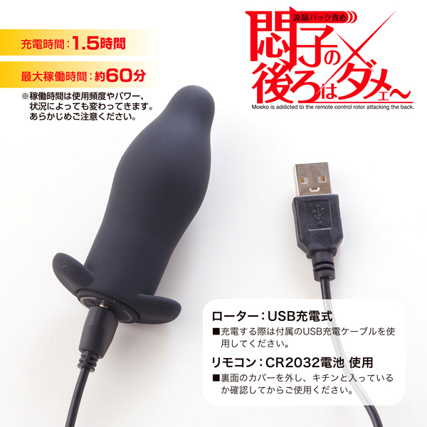 パッケージ:16.5×11.4×5.2cm 本体:アナルプラグ(8.2×4.6×3.7cm)・リモコン(7.5×3.2×1.8cm) 重量:94g 電池:プラグ(USB充電式)・リモコン(ボタン電池CR2032×1個使用)