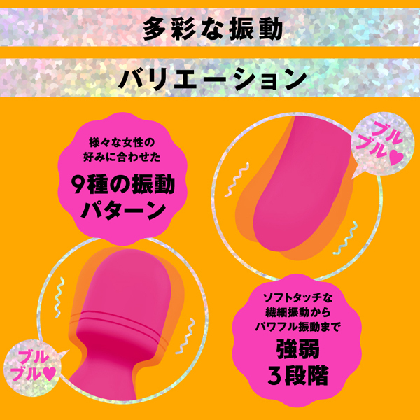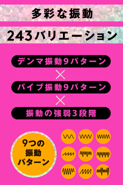 様々な女性の好みに合わせた9種の振動パターン&強弱3段階はソフトタッチな繊細振動からパワフル振動まで多彩な振動バリエーション!バイブ側にはヒート機能を搭載しています。