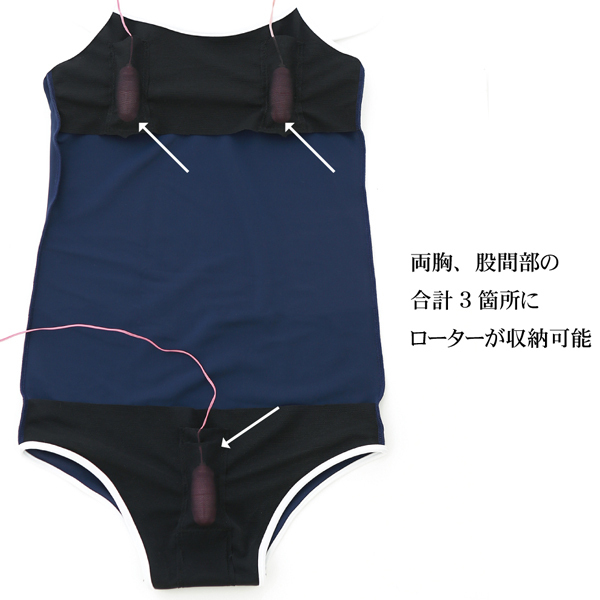 日本国内の工場で縫製され、国産のマイクロファイバー生地を使用したローターポケット付きのスクール水着!両胸、股間部の3箇所にローターを収納する事が可能です。