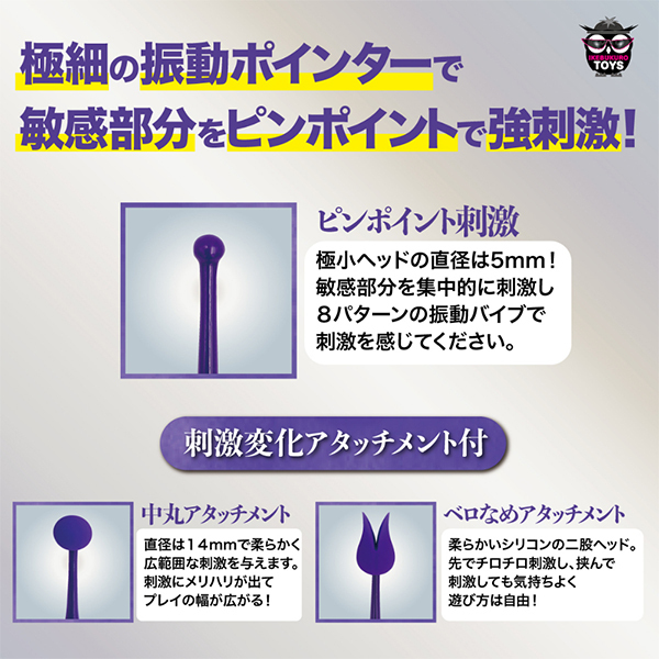 先端部分は直径5mmの極細ヘッド!2種のアタッチメントが交換可能で色んな刺激変化がお楽しみいただけます♪ピンポイントで吸って当てての集中的刺激が楽しめる吸引と振動機能の優れたローター♪IPX7の防水性能なので浅い水中での使用や、水洗いも出来て衛生的。