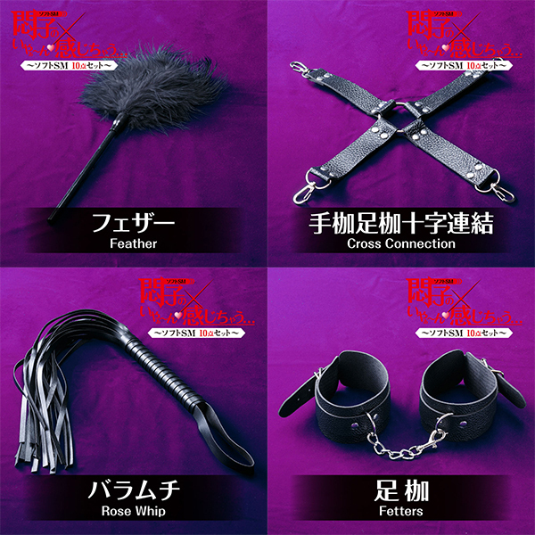 手にしてすぐに使える人気SMプレイの10点セット「悶子のいやぁーん感じちゃう」!このセットさえあれば、目隠しから拘束プレイにスパンキング、緊縛プレイにクリップ責めなどソフトなSMプレイが存分に楽しめます♪初心者でも手軽にSMが楽しめる!口の動きを遮るボールギャグやペット気分で楽しむリード付き首輪、バラムチにリード付き首輪、焦らしプレイが楽しめるフェザーにロープなど多彩なプレイができるアイテムを同梱!初めてSMプレイを楽しみたいカップルの方には特におすすめです。