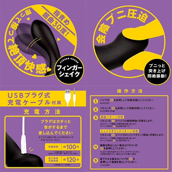 オトコのホットスポットを指のような動きで擦り責め!PPPより指を振るようなシェイクギミックを搭載したアナニーバイブが登場!30度の角度で屈曲するフィンガーシェイクギミックが、敏感部分を擦って擦って絶頂快感♪2箇所に配置された超強力Wモーターが超密着振動&会陰悶絶振動で激しく責め立てる!ギミックパターン9種類×振動パターン9種類の計81パターンがあなた好みの刺激で楽しめます♪柔らかシリコンがプニっと突き上げ圧迫するのがとっても気持ち良い会陰プニ圧迫構造。