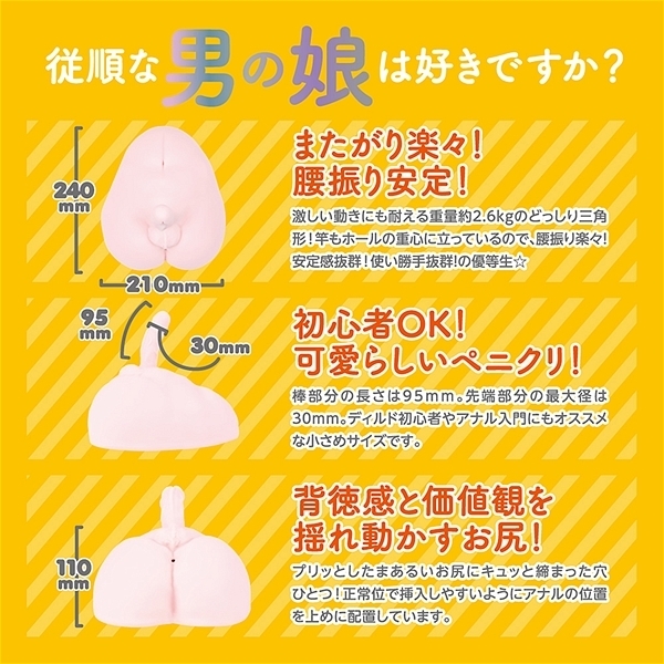 一線を越えますか?背徳感満載の男の娘ボディには「してはいけない感」がいっぱい!どっしり重量約2.6kgの据え置き完全固定型男の娘ホール!激しい動きにも耐えるどっしり三角形!竿もホールの重心に立っているので、腰振り楽々!安定感抜群・使い勝手抜群の優等生!初心者OK!可愛らしいペニクリは棒部分の長さが95mm。