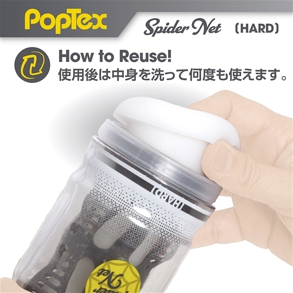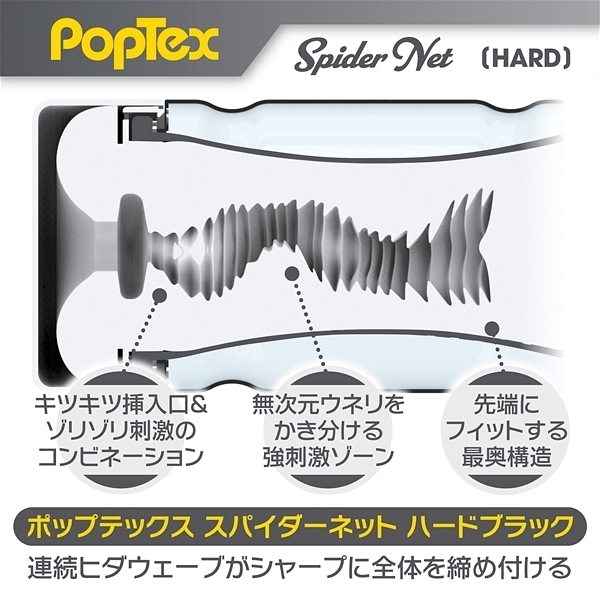 ポップテックススパイダーネットカップハード<リアルな締め付け×ネットヒダ刺激の高機能カップホール>新開発SpiderNetTechnology搭載型カップホール!ホールを包み込む柔軟性に優れたシリコンネットで最も気持ち良い形状に自動的に変形することでスポンジでは再現できない自然なフィット感とリアルな締め付け感を実現しました!内部構造は網目状のネットヒダの中心にアクセントのイボ刺激のアクセント!強力に吸い付く最奥のバキュームスポットは天面の「OneWay」シールを剥がし空気を抜いて挿入することで内部のまとわりつき感をより楽しむことが出来ます。