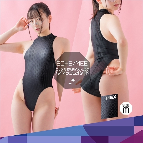 様々な素材感の黒い2WAYエナメルストレッチ素材を使用したハイネックレオタードのセクシーなコスチュームです。