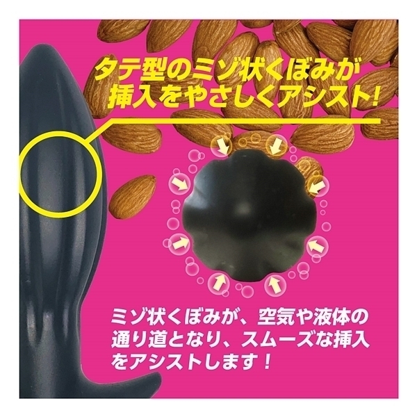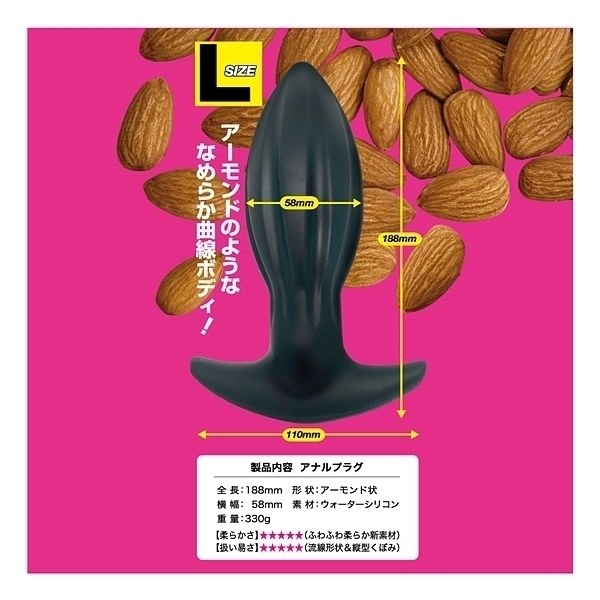 アーモンドフォルム×ウォーターシリコン!形状と素材にこだわった、新感覚ア●ルプラグが新登場!アーモンドナッツのような形状は、先端部に向かってすぼんでいく流線フォルムとなり、スルッとした挿入感を生み出します。
