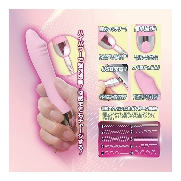 ボタンを押すごとにアクションが切り替わりますので、お好みの振動アクションを見付けましょう!さらに、チャージ方法はUSB方式なので、モバイルバッテリーやPCなど様々な環境で充電可能。