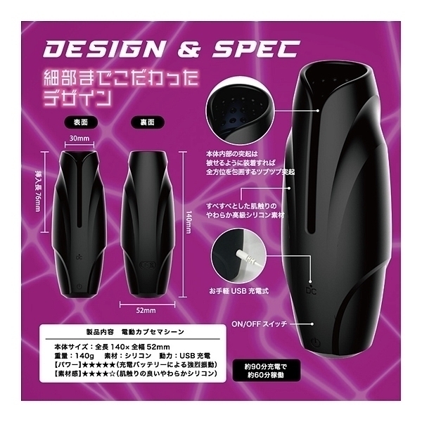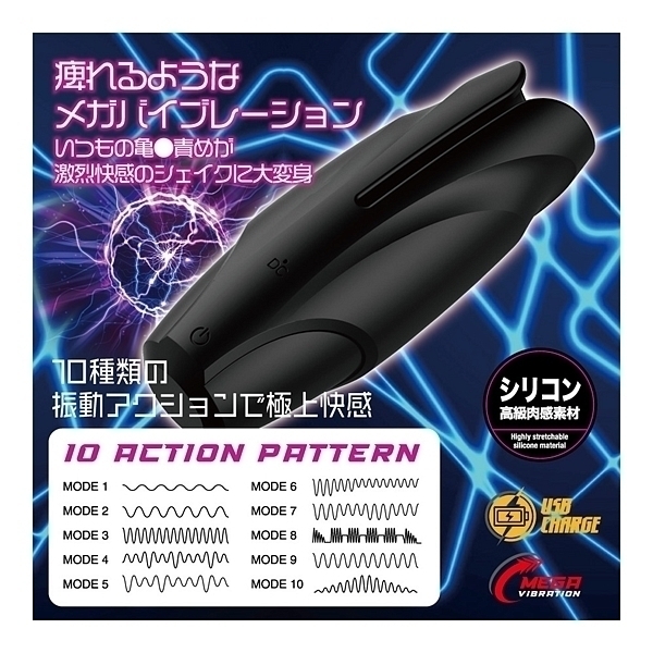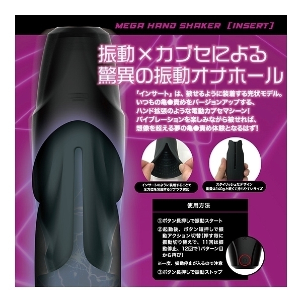 激コキ!衝撃快感が貴男を襲う!振動×カブセによる、驚異の振動オナホールが新登場!いつもの亀●責めが、激烈快感のシェイクに大変身!!振動電源ONすれば、痺れるようなメガバイブレーション!さらに楽しめる振動アクションは、全10パターン!その激烈振動のハイパワーを実現させる、USB充電式バッテリー!本体内部の突起は、兜のようにインサートすれば全方位を包囲するツブツブ突起!すべすべとした肌触りの、やわらか高級シリコン素材!約90分充電で、約60分稼働が可能!「インサート」は、被せるように装着する兜状モデル。