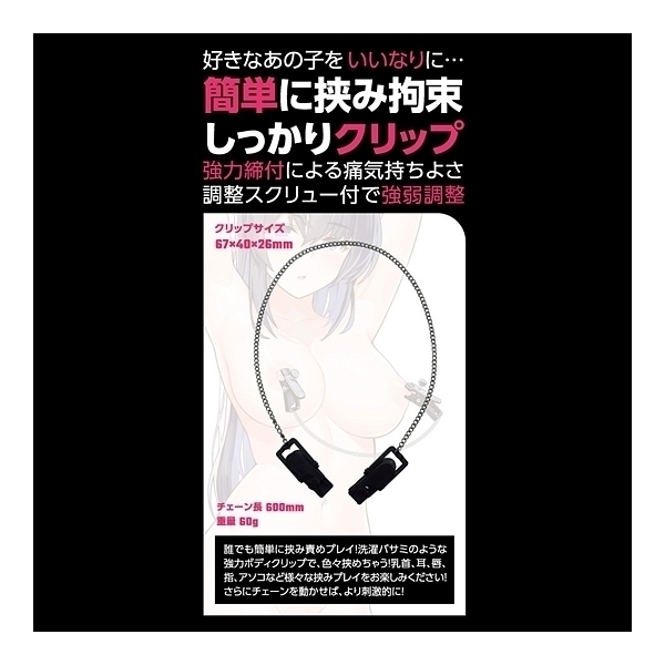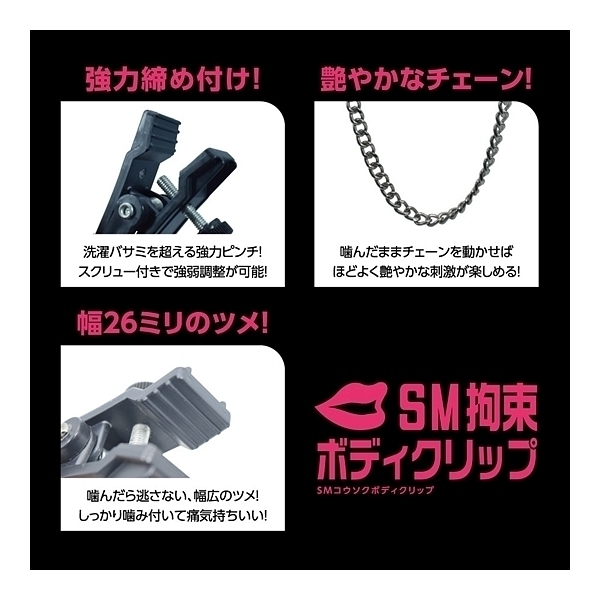SMプレイを盛り上げるアイテム、SM専用クリップ「SM拘束ボディクリップ」!両乳首からチェーンが伸びるその姿は、艶やかな官能的ファッション。
