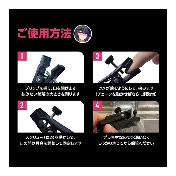 クリップの使用する箇所も乳首だけでなく、耳や唇や指やアソコに、と場所を限定せずに色々にお使いいただけます。