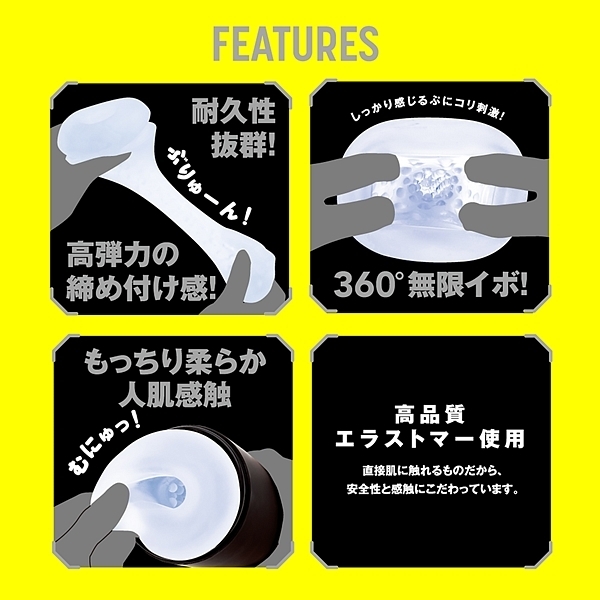 耐久性抜群の高弾力素材が吸い付きながら締め付けてくる搾精吸引!もっちり柔らか人肌感触の挿入口と360°無限イボはしっかり感じるぷにコリ刺激がリアルを超える!静音設計≦65dB。