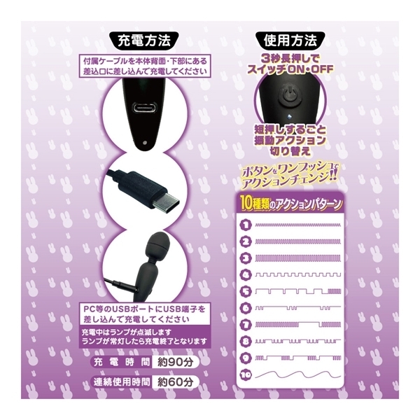 アクションパターンは10種類もありますので、お好みの振動を見付けましょう!さらに、充電方法に最新となるUSB-C方式対応。