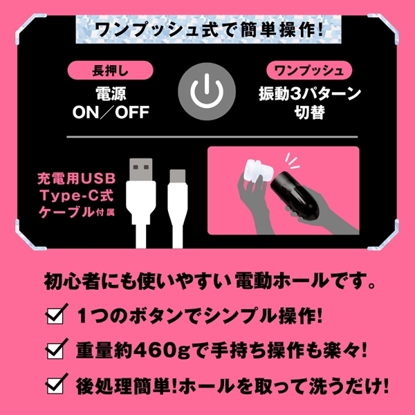 1つのボタンでシンプル操作!後処理簡単!ホールを取って洗うだけ!重量約460gで手持ち操作も楽々!インナーホールは直接肌に触れるものだから、安全性と感触にこだわり高品質なエラストマーを使用しています。