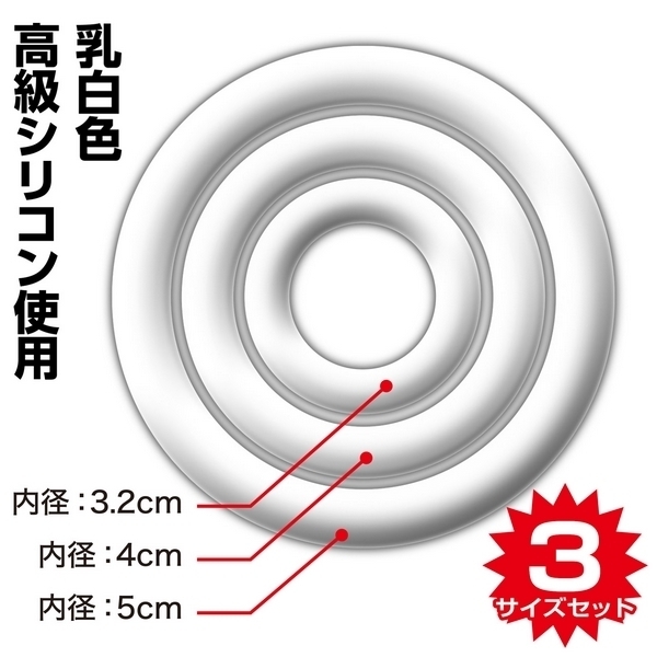 ●サイズの異なるリング×3個セット●内径:5cm(大)・4cm(中)・3.2cm(小)●乳白色の高品質シリコン素材を使用●伸縮自在で肌触りも良く装着感抜群。