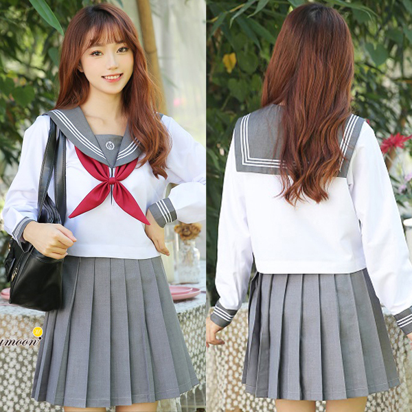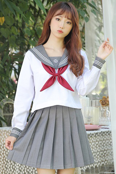 襟と袖口には3本の白ラインがシャープな印象♪動くたびヒラリと揺れるプリーツスカートで可愛くアピール!グレーカラー、Mサイズ